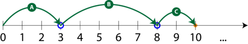 E aproape la fel ca primul scenariu de mai sus, mai puţin ultimul pas: la momentul (A) faci trei paşi la dreapta, la momentul (B) faci încă cinci paşi la dreapta, dar la momentul (C) faci doi paşi la stânga: