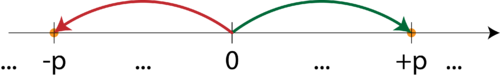 O chestie interesantă în desenul de mai sus: se pare că axa numerelor nu începe la stânga cu zero şi merge doar către dreapta (săgeata către dreapta, +p) -- de fapt, se pare că pot să pornesc de la zero şi către stânga (săgeata către stânga, -p). Dar am zis mai devreme că p poate să fie oricât de mic sau de mare, deci aşa cum pot să mă duc la dreapta de la zero către 1 sau către 2 sau către 3, la fel pot să mă duc şi la stânga către... -1 sau -2 sau -3: