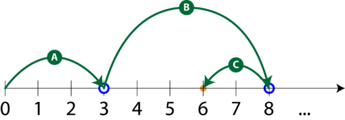 E aproape la fel ca primul scenariu de mai sus, mai puţin ultimul pas: la momentul (A) faci trei paşi la dreapta, la momentul (B) faci încă cinci paşi la dreapta, dar la momentul (C) faci doi paşi la stânga: